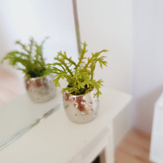 Dolls House Silver Round Pot with Green Plant, 1:12th Scale, Miniature Plant Pot, Dollhouse Accessories