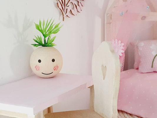 Dolls House Lovely Wooden Happy Face Plant Pot with Plant 1:12th Scale, Miniature Pot