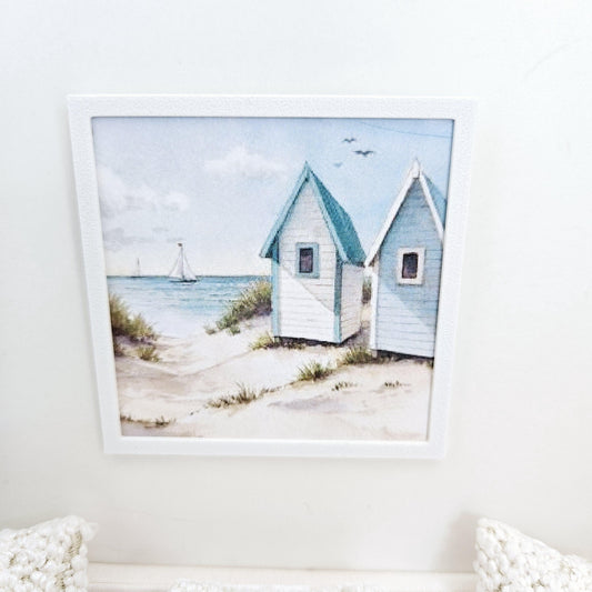 Dolls House Modern Framed Wall Art, Beach Hut picture, 12th scale, miniature wall picture for any room