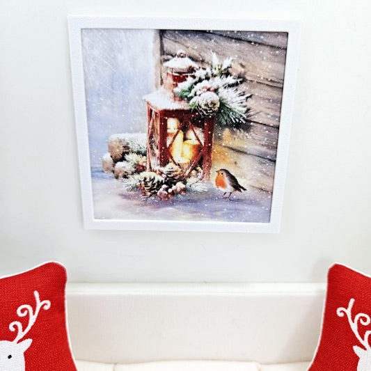 Dolls House Modern Framed Wall Art, Christmas Lantern & Robin print, 12th scale, miniature wall picture for any room