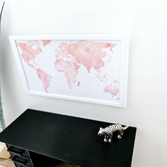 Dolls House Modern Framed Wall Art, Pink World Map print, 12th scale, miniature wall picture for any room