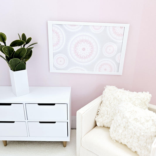 Dolls House Modern Framed Wall Art, Pretty pink circles print, 12th scale, miniature wall picture for any room