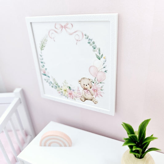 Dolls House Modern Framed Wall Art, Pink Teddy Bear picture, 12th scale, miniature wall picture, Nursery wall art