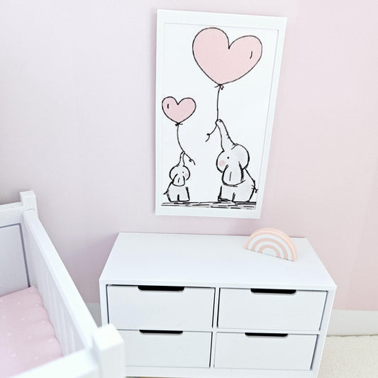Dolls House Modern Framed Wall Art, Nursery Print. Cute pair of Elephants with Balloons, 12th scale, miniature wall picture. Nursery art