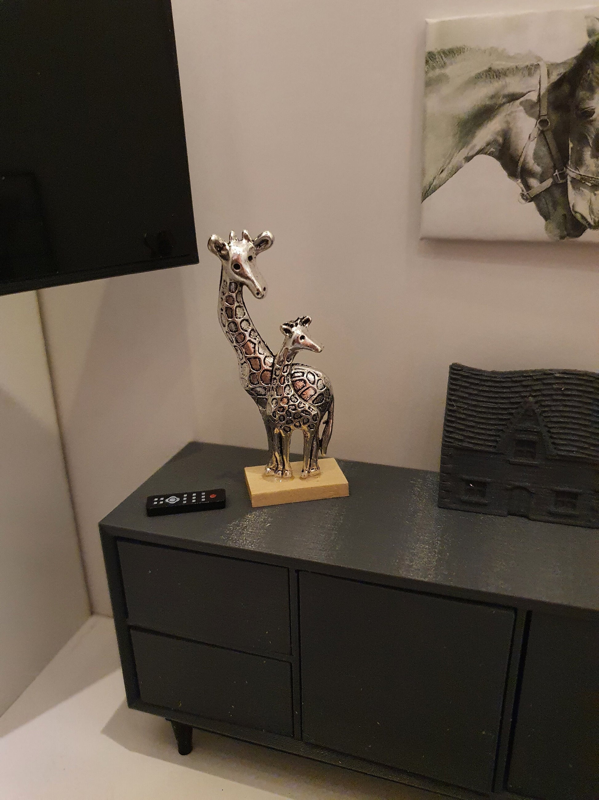 Dolls House Cute Mother & Baby Giraffe Ornament on a wooden stand , 1:12th Scale, Miniature Giraffe a stand