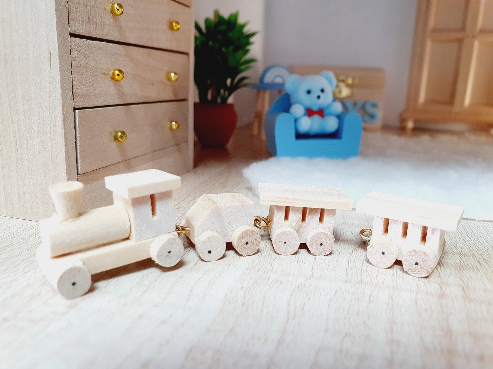 Bring a touch of playful charm to your dollhouse nursery or child’s bedroom with this adorable 1:12 scale wooden toy train. Crafted with delightful detail, the train consists of four hook-together pieces, making it a sweet and interactive display item in any miniature play space.