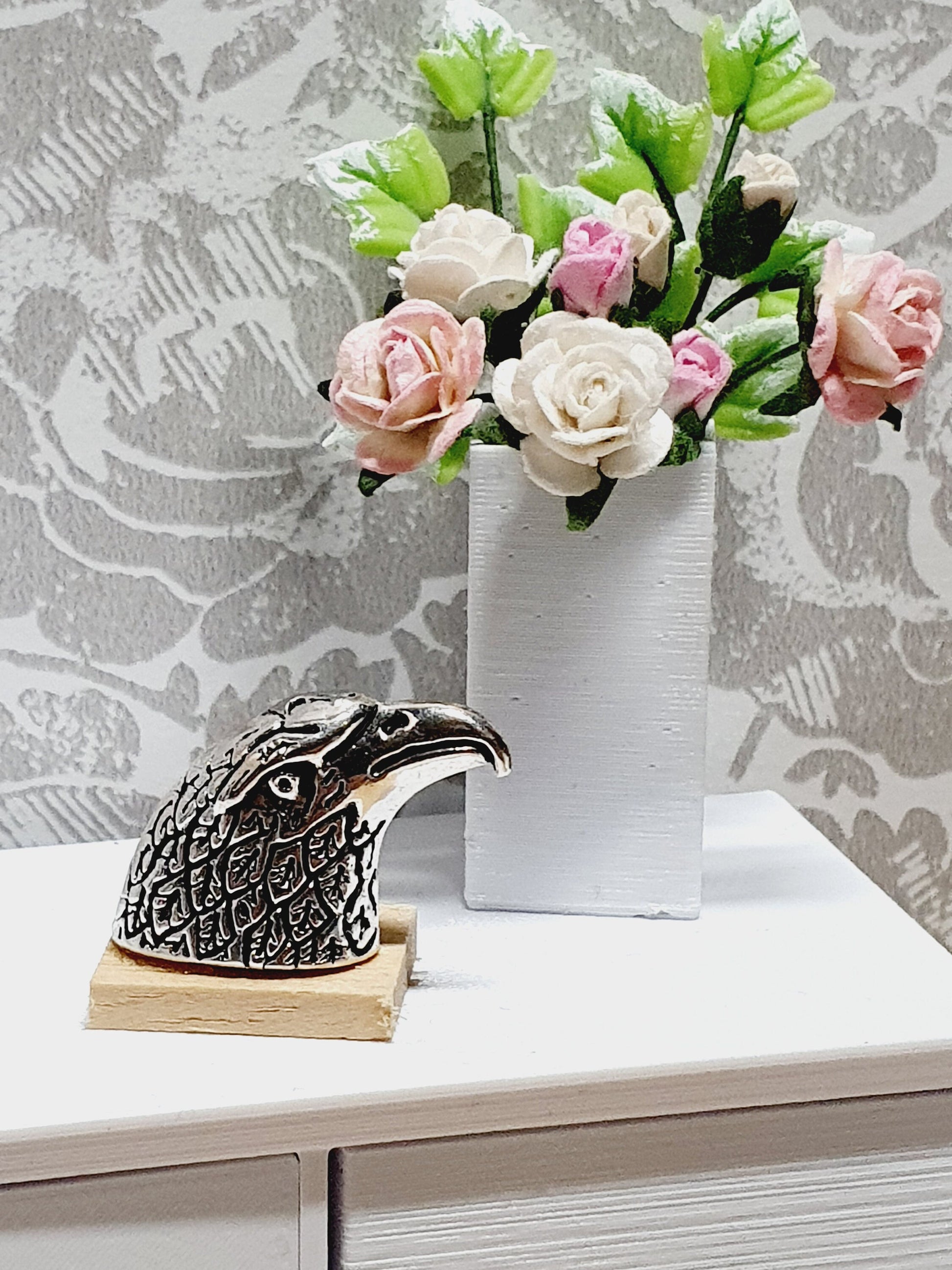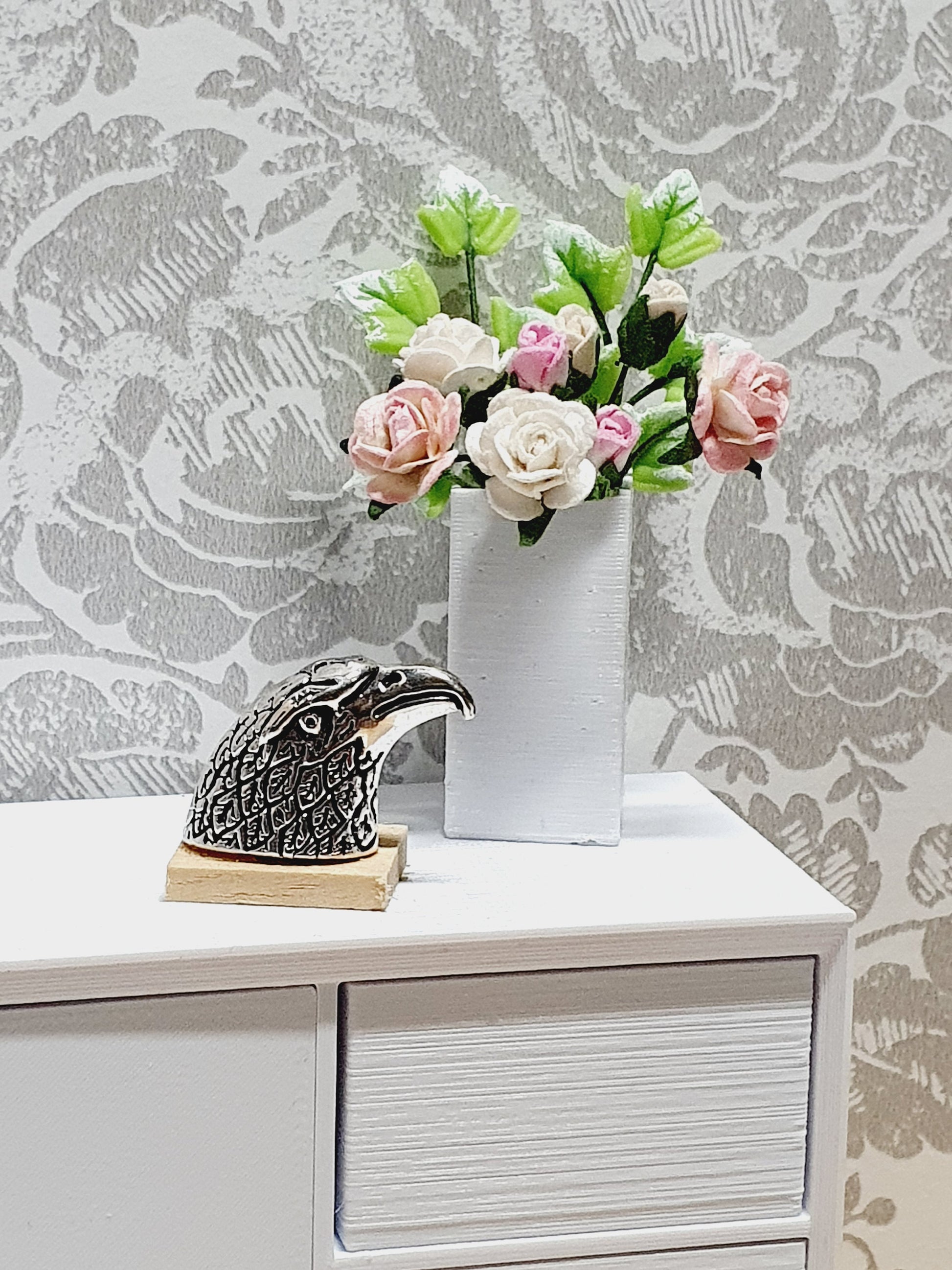Add a touch of bold character to your miniature interior with this finely detailed 1:12 scale eagle head ornament. Mounted on a small wooden base for stability, this striking miniature sculpture is perfect for display on a dollhouse sideboard, bookshelf, or mantel.