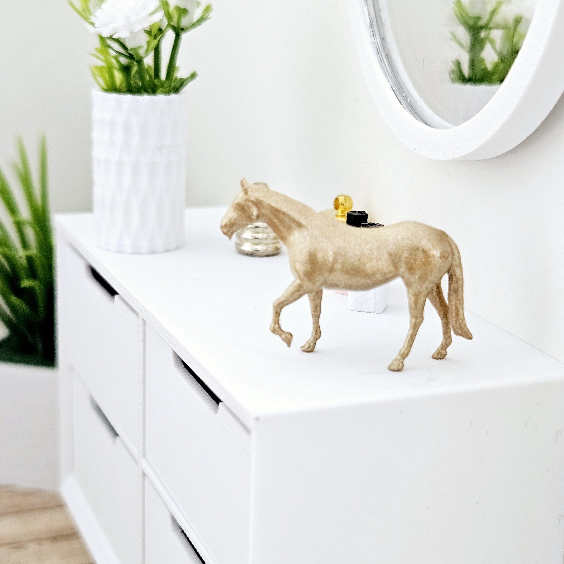 Add elegance and character to your dollhouse with this beautifully detailed horse ornament, crafted from cast resin and hand-painted in your choice of colours. Perfect for both modern and traditional interiors, this 1:12 scale miniature is ideal for display on mantlepieces, sideboards, or bookshelves.
