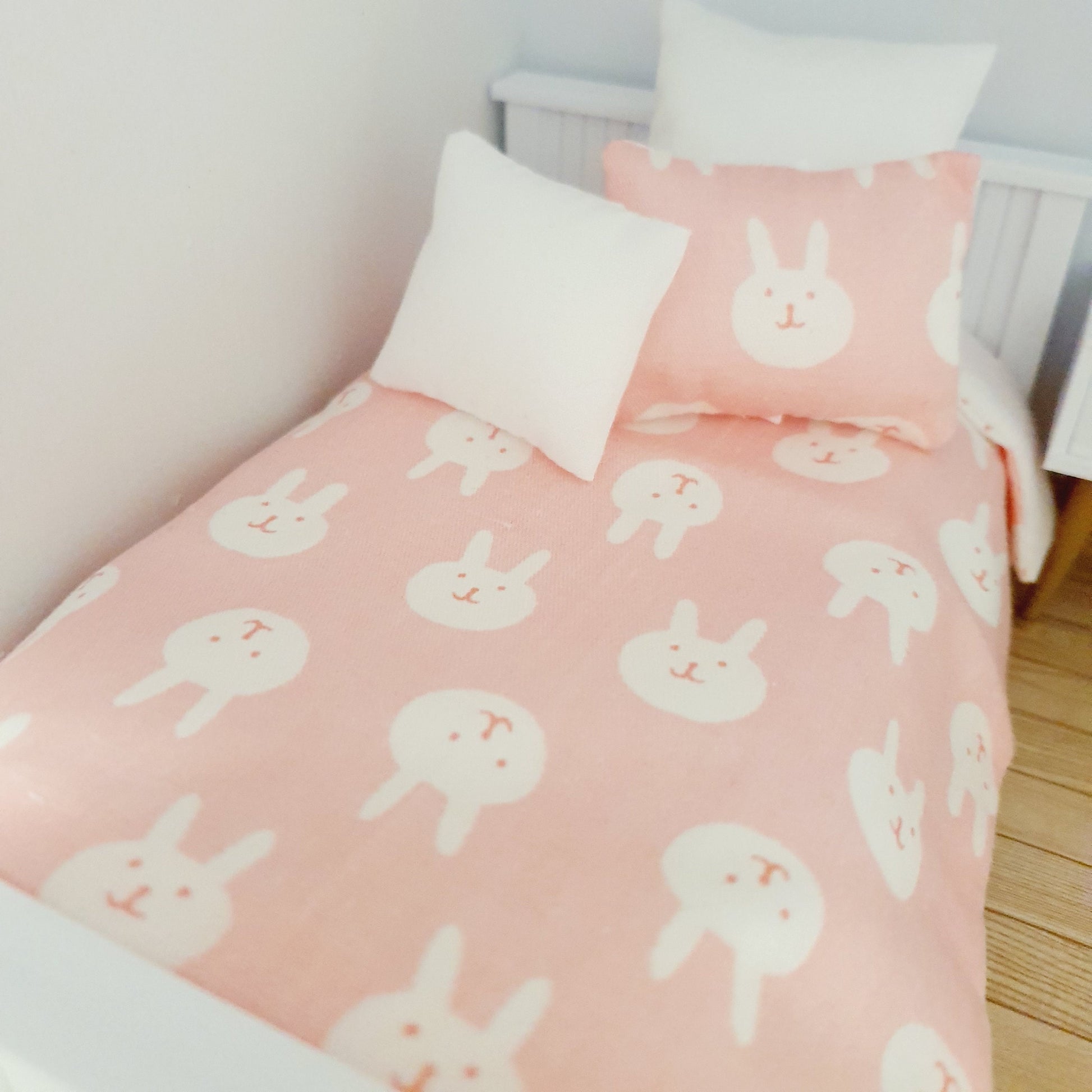 Dolls House Junior Bedding Set – Pink with White Rabbits, Handmade in England, 1:12 Scale