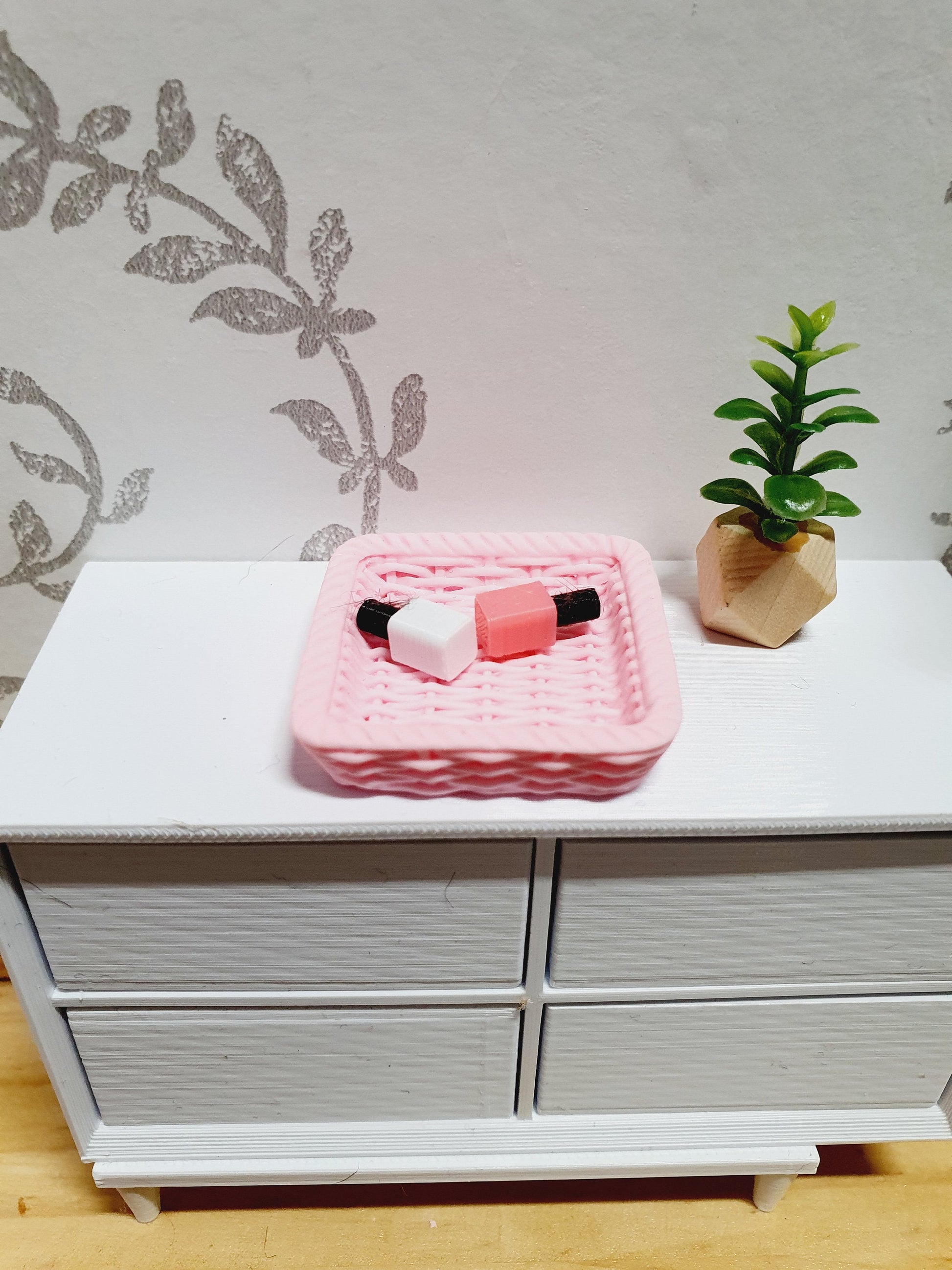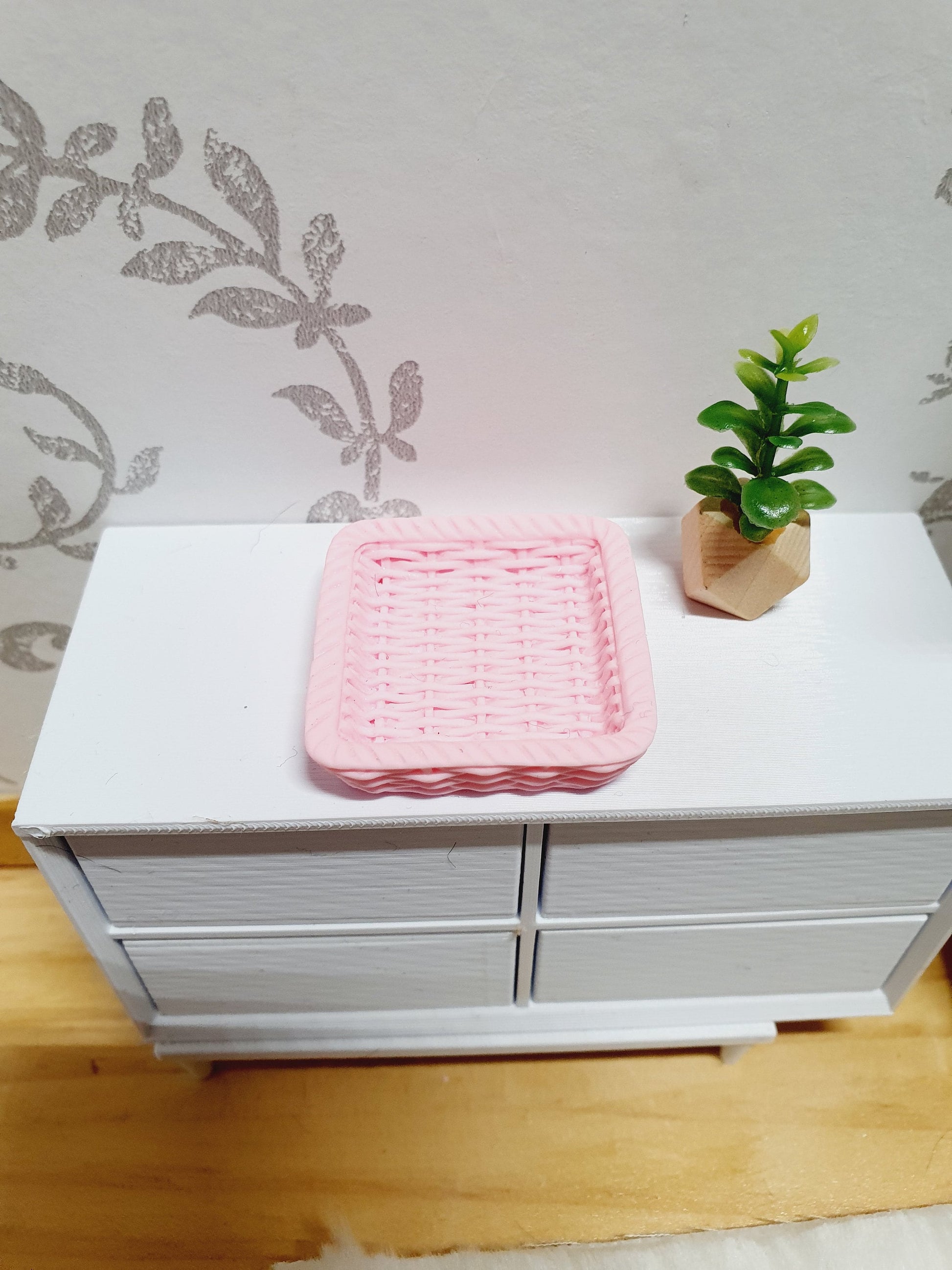 Add a stylish finishing touch to your miniature scenes with this modern rattan tray, perfect for bedrooms, bathrooms, or dressing tables in your 1:12 scale dollhouse. Whether you're displaying tiny perfumes, rolled towels, or decorative accents, this elegant tray brings texture and charm to any space.