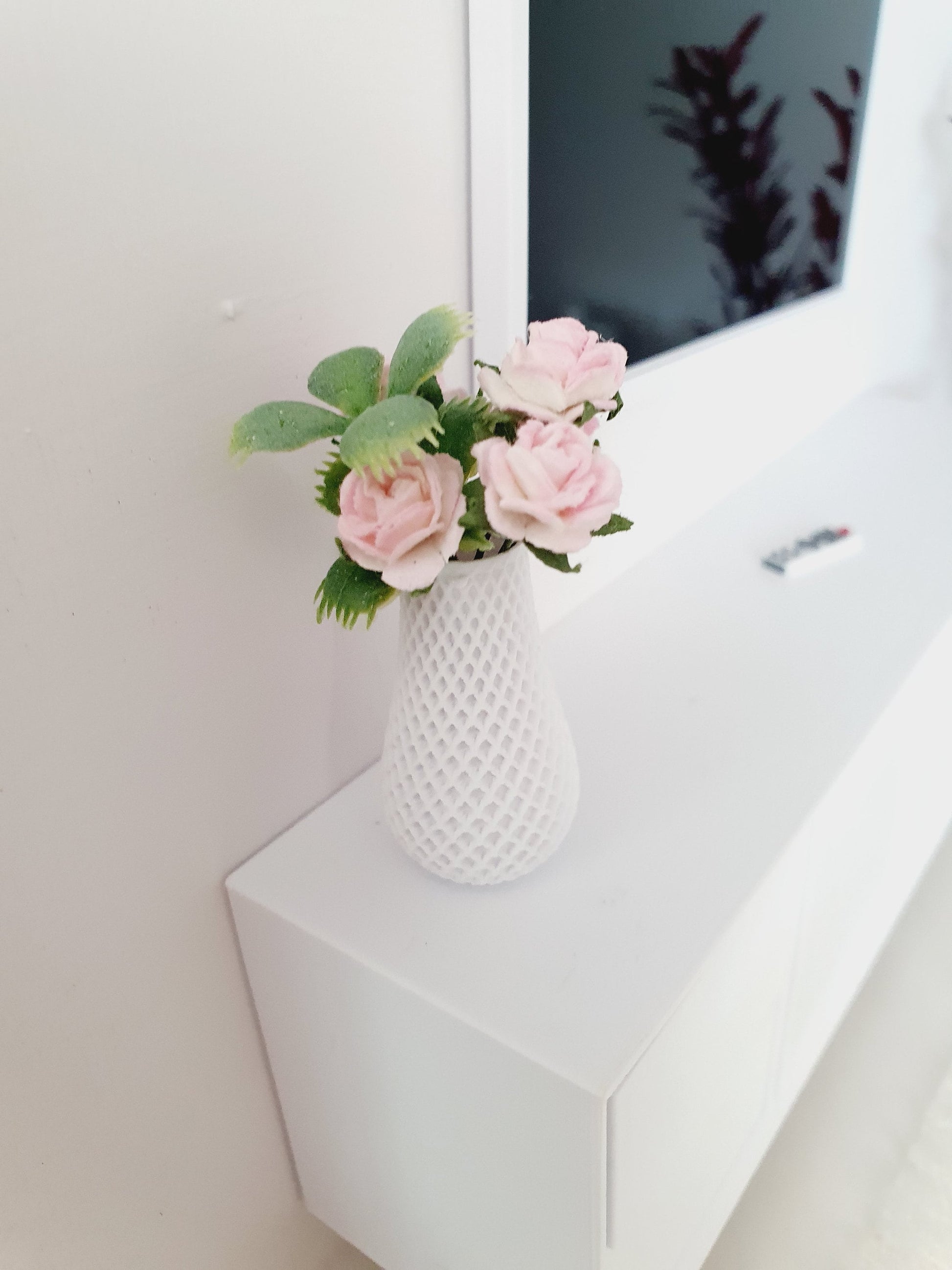 Add a delicate floral touch to your dollhouse with this charming arrangement of pink roses in a coloured vase. Designed for 1:12 scale, this miniature bouquet features a choice of light or dark pink roses with soft green leaves, making it the perfect accent for a dining table, sideboard, or windowsill.