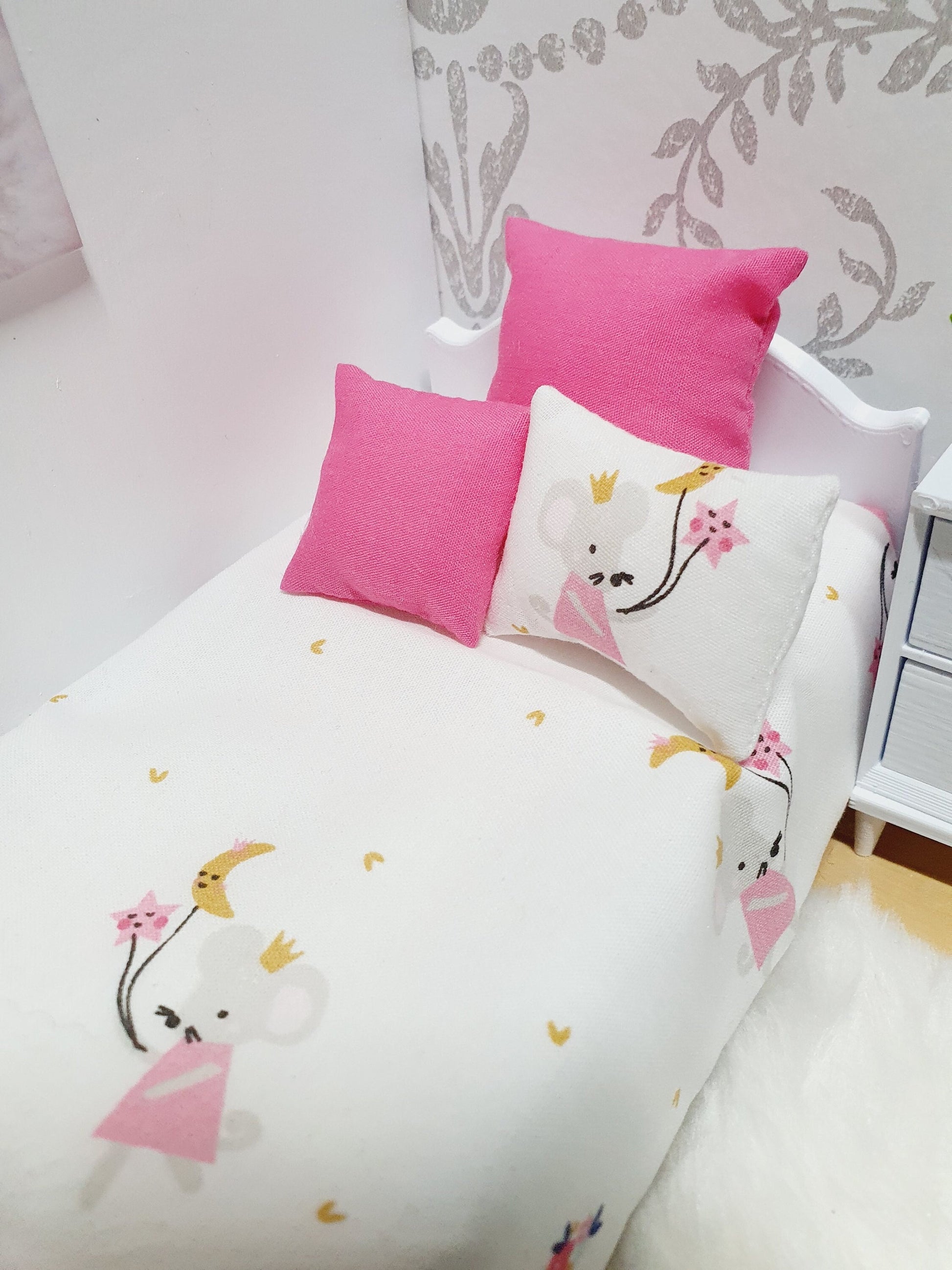 Dolls House Single 4-Piece Pink Mouse Bedding Set 1:12th Scale