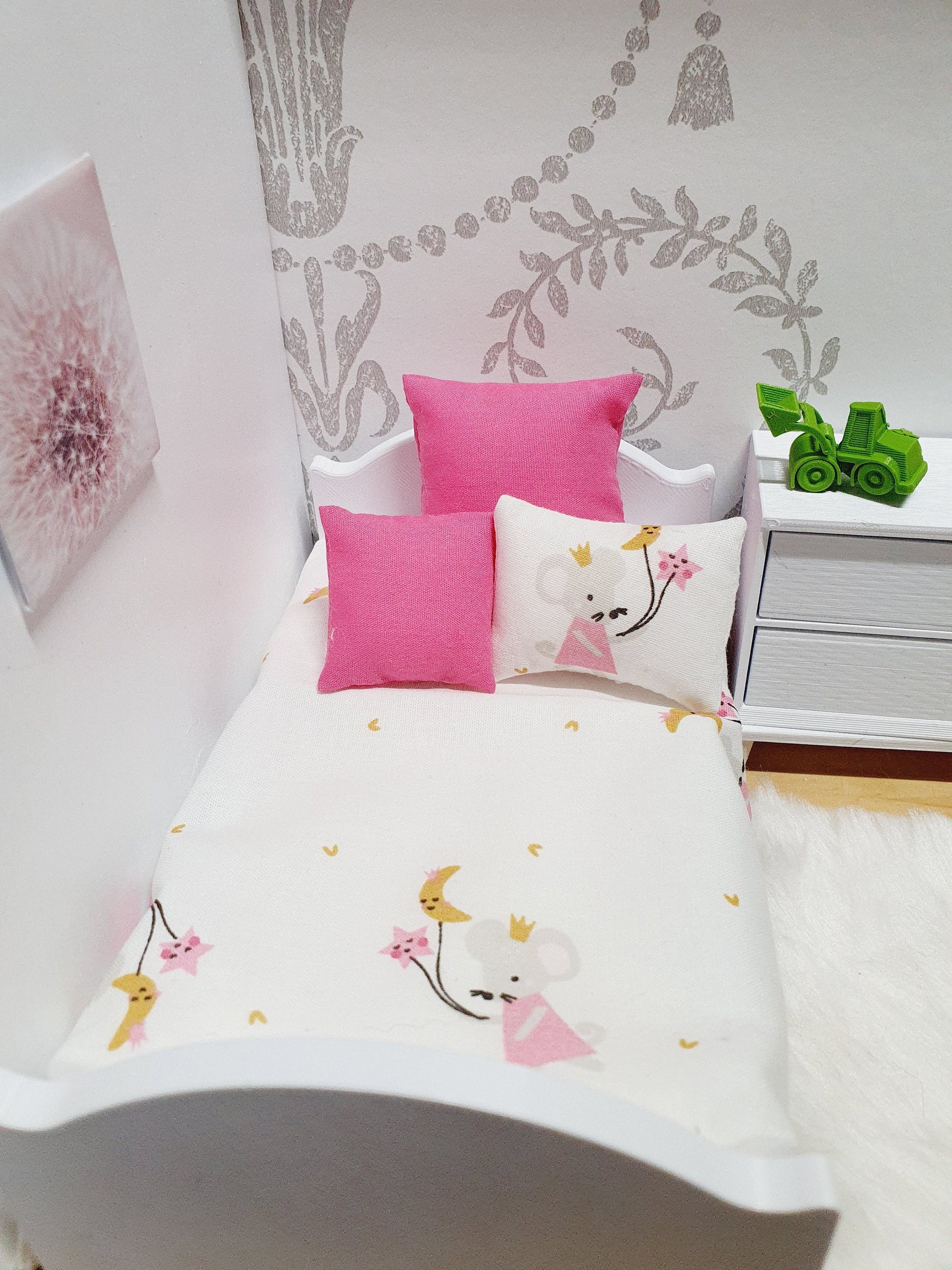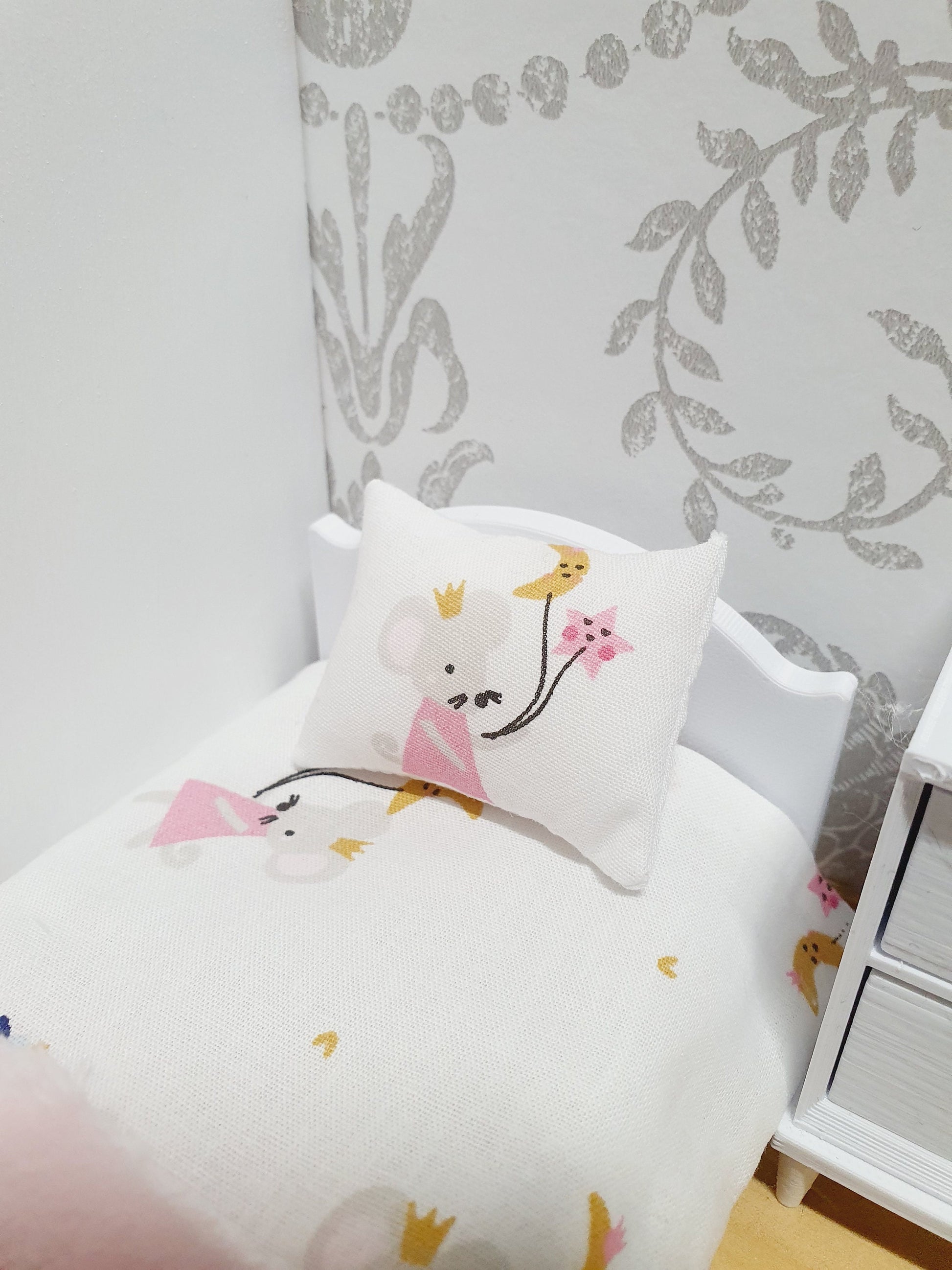 Pillow 1: 3cm x 5cm (Pink Mouse Design) Scatter cushion: 3cm x 3cm (Matching Design) Additional Information:Measurements are approximate The listing is for bedding only Cushions have polyester filling 1:12th scale miniature bedding set Matching accessories available in our shop Slight Variations in Design: As each set is handmade, slight variations in fabric cutting and pattern placement may occur. While small differences may appear, the overall style and quality remain consistent. Items are not suitable for children under 14 years old.Royal Mail postage prices are "per order," not per item. Shipping is combined automatically at checkout.Postal Rates:UK: £3.99 – Tracked EU: £8.99 – Tracked USA & Canada: £9.99 – Tracked Thank you for visiting Pretty Miniatures Ltd! Company Number: 14692847 | VAT Registration Number: GB481554085